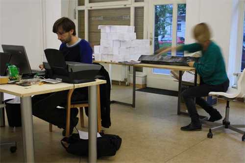 Dieses Projekt ist geprägt von einer bewusst kurzfristigen Arbeitsweise und limitiert durch die gesetzten Einschränkungen der Arbeitsmittel im Büro. Die vorliegenden Projekte haben wir konzentriert auf Themen, die unserer jeweiligen künstlerischen Praxis entsprechen und bei denen wir uns treffen können oder aufeinander prallen - wie zum Beispiel Erinnerung, Geschichte, Zeichen, Markierungen und Oberflächen sowie Standard vs. Individuum." (Heidi Hove und Jens Axel Beck, Berlin im Mai 2010)