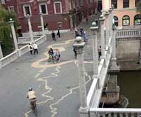 auf die Abdrücke der Bodenversiegelung als auch die weiten Gehwege auf poröse