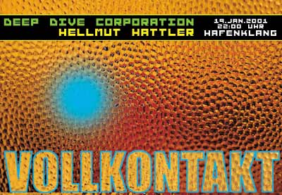 Das wird eine lange Nacht! ...denn die Clubförderungsreihe Vollkontakt geht in die 3. Runde: Am Freitag dem 19.01.2001 im Hafenklang/ Einlass 22:00 Uhr Die Liveshow: Der Downbeat von Deep Dive Corp. zusammen mit Hellmut Hattler am Bass und Clemens Krallmann von Hippiehaus am Schlagzeug. Die DJ-Nacht: DJ Agimar, DJ Turn, DJ Andreas Siebert vom Dreiklang Warmer House und Trance, sprich: moderne elektronische Tanzmusik die ganze Nacht! Also nehmt Euch ansonsten nix vor, sondern feiert im Hafenklang. Organisiert von RockCity Hamburg e.V.: (http://www.rockcity.de) Präsentiert von Szene Hamburg: (http://www.szene-hamburg.de) Finanziert von der Hamburger Kulturbehörde und Viva 2: (http://www.hamburg.de/Behoerden/Kulturbehoerde/)( http://www.viva.tv/) Wir bedanken uns bei Susanne Hasenjäger und Klaus Wellershaus, die das Konzert für den NDR 4 mitschneiden. Vollkontakt 4. Runde am 22.02.2001 im Molotow mit: Bul Bul, Havana Son Club, DJ Litmanen, DJ Amande Japonais und dem Lovetank Soundsystem (in der Meanie Bar)